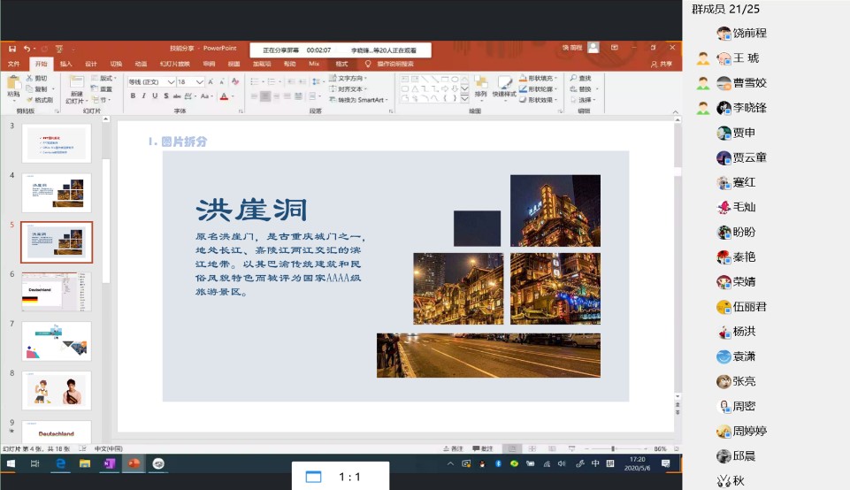 饶前程老师则从技术角度出发,分享了培训过程中学习的PPT美化、图片拆分与美化、PPT插件使用、视频录制、视频课件制作等方面技巧。饶老师通过屏幕分享进行了在线演示,并共享了相关的软件资源,相信对老师们提高课件制作水平、促进信息化教学都有很大帮助。
