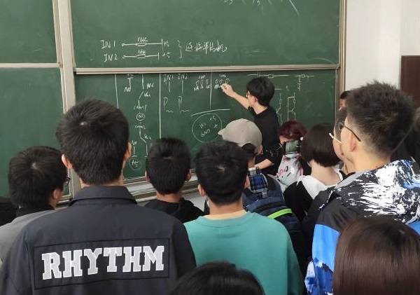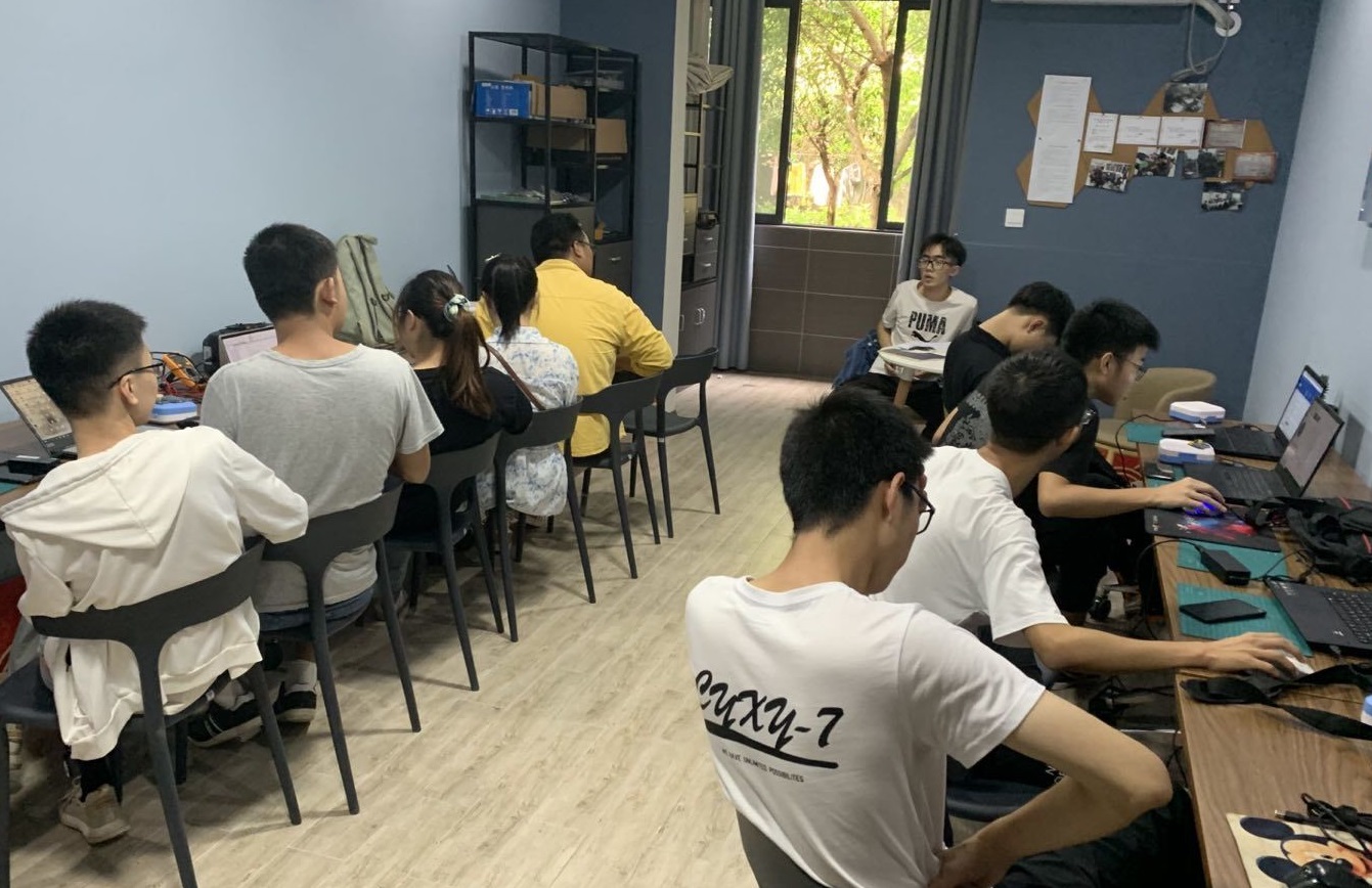 学长导师作为朋辈圈层的重要支柱之一,长期任务之一就是“成果反哺”,工坊的学生每周周天晚上,在工作室集合,接受统一的电路课程培训,由大三的学长进行授课、答疑,并带领大家动手实操,检验理论知识的可行性,此种模式既能够获得丰富的理论知识,也能将理论知识转化为实际研发能力。同在一个工作室,同上一堂课,互动、碰撞、讨论问题的氛围,形成了“圈层闭环”的良好效应。