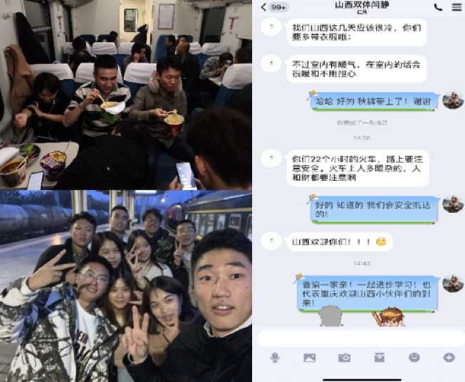 重庆到太原全程1500多公里,需要乘坐20余小时,可以说旅程是疲惫与乏味的,可我们并不这样。在火车上,大家一起吃着泡面,一起畅谈未来人生规划,一起解决项目二中遇到的问题,原本枯燥乏味的旅程顿时变得丰富多彩起来。远在千里之外的山西小伙伴也不忘发来各种旅途提示,让我们提前感受到了山西小伙伴的热情与温暖,时间在欢声笑语中悄然度过,我们终于到达了目的地——山西农业大学信息学院。