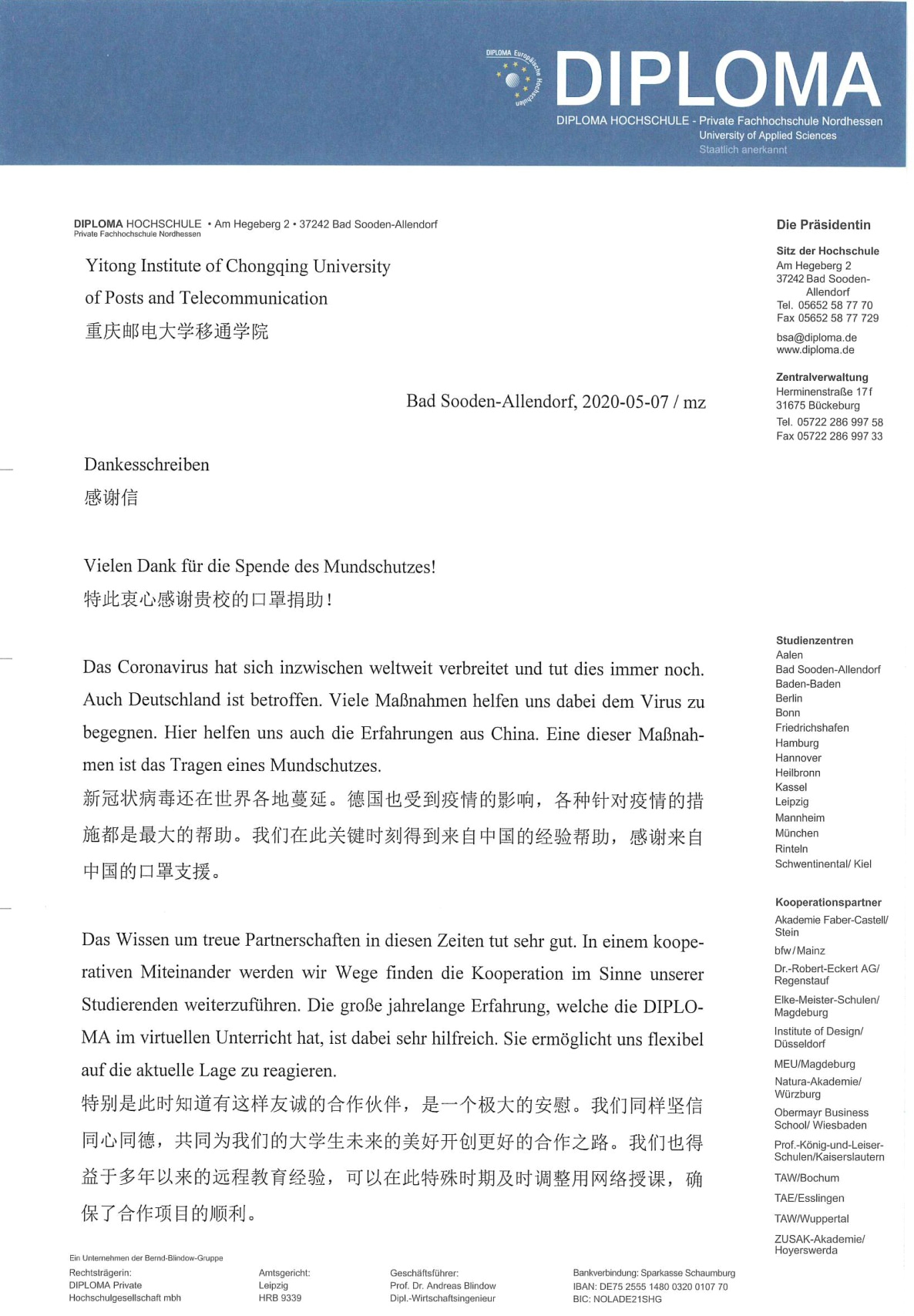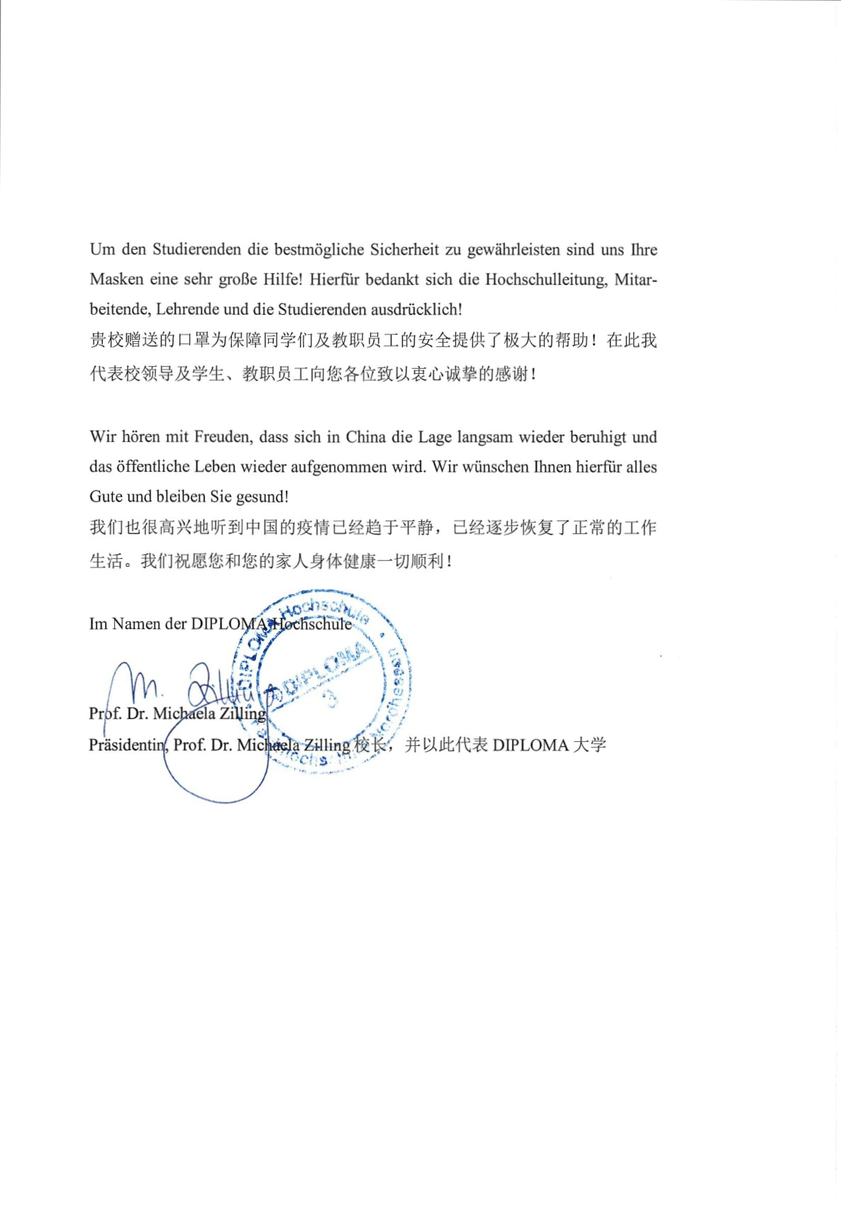 同时,学校向德国北黑森应用技术大学表示慰问,表达了共同抗疫的态度和坚定的信心。加强合作与沟通,做好我校预备赴德留学生和在德留学生的教学与管理,做到“停课不停教,停课不停学”,尽量做到不影响学生留学进程。德国北黑森应用技术大学校长Michaele Zilling教授向学校发来感谢信,对这份深厚情谊表示由衷感谢,并表示疫情期间做好预备赴德学生和我校在德留学生的教学安排和学生管理,确保留学生的安全。中德双方共同努力开创更好的合作之路。