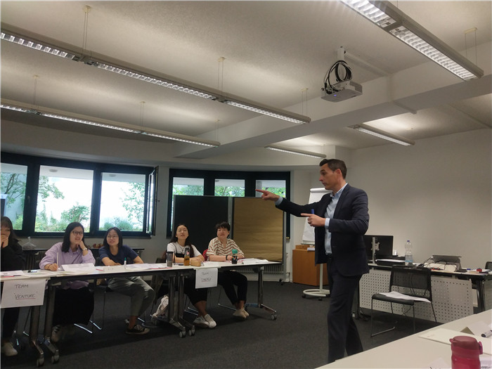 距我们抵达波恩已有5天,中间我们度过了在波恩的第一个周末,游览了德国的科布伦茨市。今天是新的一周开始,在外教老师Neil的带领下,我们又继续进行我们的课程——金融英语(“ English of Financial”)。他运用新颖的教学方式和多样、有趣的教学道具向我们传送着各种知识,让我们了解到了和国内完全不同的德国风土人情以及历史文化。每一节课开始,Neil老师都会用一个小金融案例或知识甚至是一个游戏作为导入,生动立体,这与国内有些老师的传统教育方式完全不同。今天Neil老师便以“如何在商务会谈中给对方建立一个好的第一印象?”这一小问题作为引入,接着告诉我们演讲拥有着的三大要素——hand、head和heart,这即为中国人更为注意的逻辑思维结构,德国人更为注重的真实准确性和美国人更注重的情绪带动,这也反映了不同国家的文化差异。就“不同国家的文化差异具体表现在什么地方”这一问题,我们和Neil老师展开了讨论。通过讨论我们了解到了更多曾经不知道的文化细节差异,消除了一些原有的刻板印象。在Neil的课堂上,小组探讨环节是必不可少的。通过小组合作去完成某一件事,这不仅让我们通过努力找到了问题的答案,还锻炼了我们的各项能力,比如语言组织能力、思辨能力、创造能力、演讲能力等。