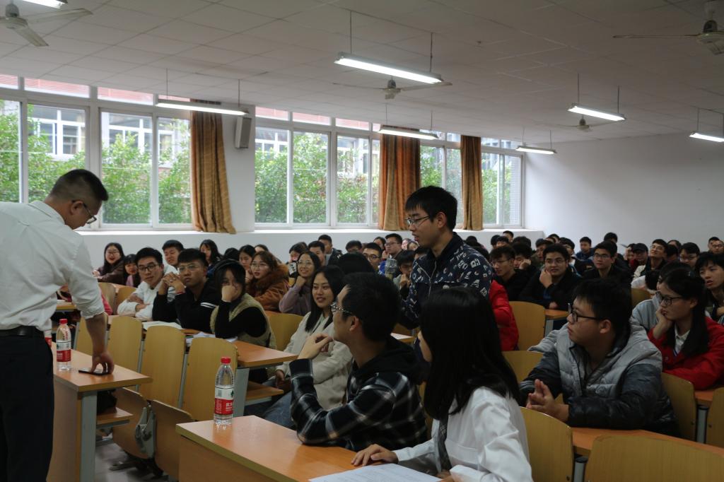 目标是指引人生前进的航向,许多人一事无成,就是因为他们缺少排除万难、迈向成功的动力。姚锐校友风趣地讲述自身经历:“记得我大三的时候还很贪玩,直到有一天我发现同学们都在为自己的未来焦虑,我也开始迷茫起来,如果继续迷茫,可能搬砖都没人要了!”姚锐校友还说:“一时玩乐没什么,只要明白自己的方向,清楚自己的规划,懂得在什么时候做什么事就好。”姚锐校友的方言式教导让现场氛围达到了高潮,同学们也掌声连连。