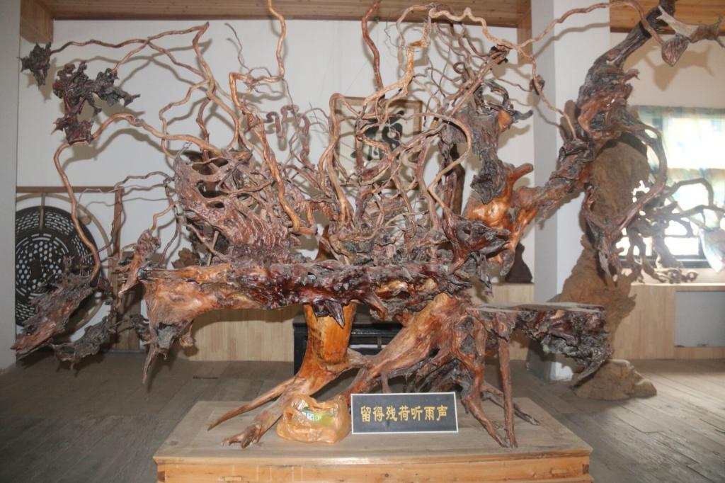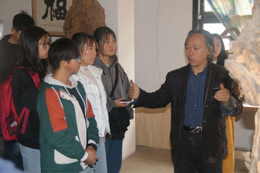 经过了一个多小时的车程,我们到达了目的地彭勇根雕博物馆,博物馆名叫“木石缘堂”是由彭勇老师的妻子所刻,清新雅致。馆前一对石狮虽有些损坏,但神采依旧被保留至今,古朴木制大门充满着古色古香的文化气息。走进博物馆,形态各异、多种多样的根雕作品引起了同学们的惊叹,不似大自然的鬼斧神工,也没有玉石的珠光宝气,有的只是岁月的痕迹和新生的气息。腐根断枝随水流,一生辉煌至此休。幸遇惜才痴雕客,枯木逢春再千秋。根雕就是这样一门化腐朽为神奇的艺术,枯木逢春,败根回生,在彭勇老师手中流转的生气。