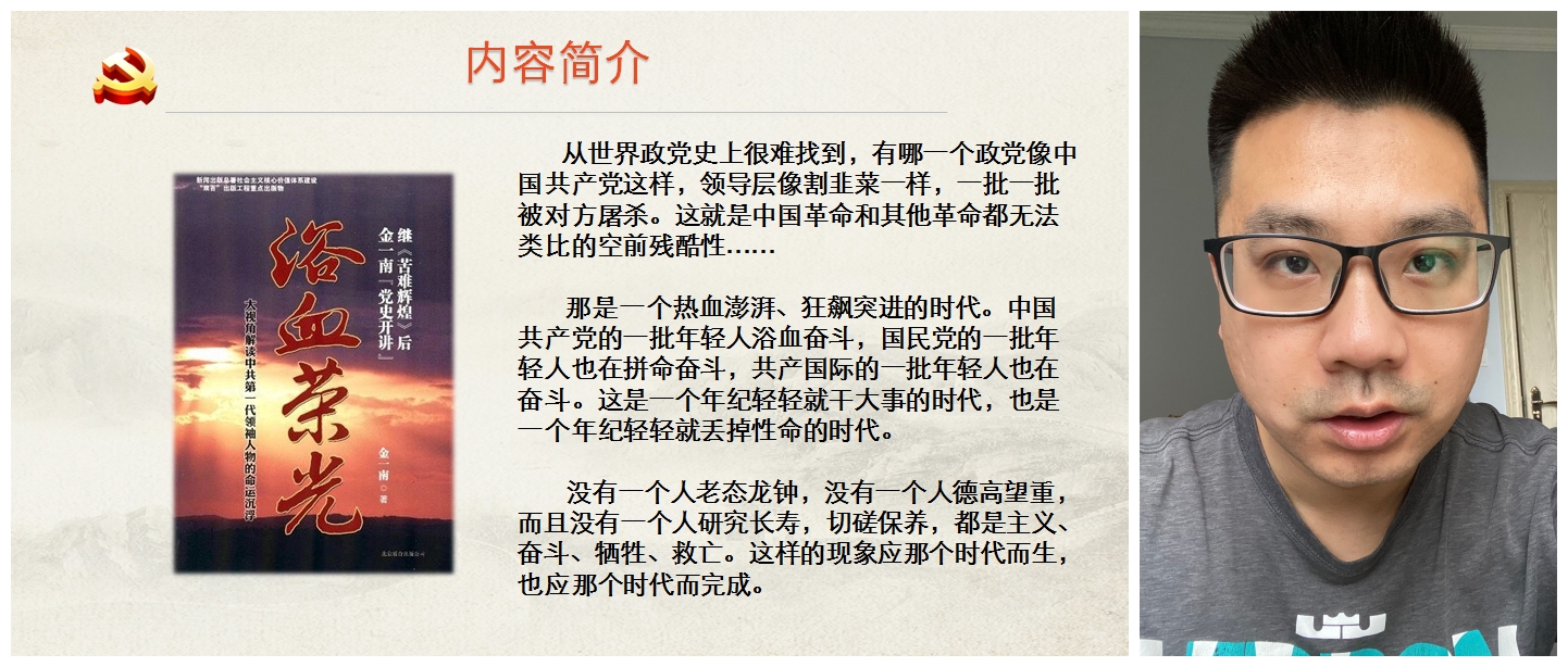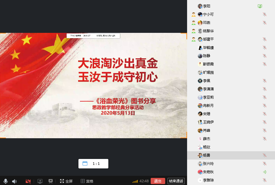 习近平总书记曾说:“学习是立身做人的永恒主题,也是报国为民的重要基础。梦想从学习开始,事业从实践起步。当今世界,知识信息快速更新,学习稍有懈怠,就会落伍。”5月13日下午17时,为进一步促进思政教师学思并举、学以致用,思政教学部在云端开展了经典研读分享活动。此次活动由李阳老师带来《浴血荣光》一书的阅读感悟,思政教学部邓燕主任进行了主持。