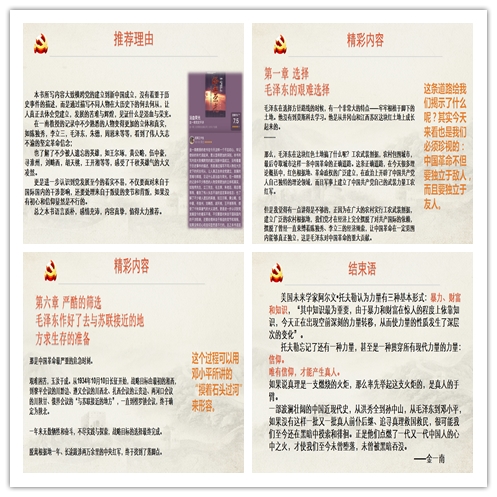 随后,李阳老师从内容简介,推荐理由和精彩片段三个方面向老师们进行了分享。在内容简介上,李老师介绍该书是把党和军队放在国际大背景下进行讲述,还原了在当时的国际国内形势下,第一代中共领导人如何探索革命救国之路,如何排除一切困难,如何在逆境中壮大。在推荐理由上,李老师谈到之所以推荐本书,是因为本书与以往历史书最大的不同在于更重视人物命运的变化,将人物与事件相交融,以全新视角解读了第一代中共领导人为了理想与信仰,浴血奋战、夹缝中求生存的艰难与韧性,用实际行动诠释了使命与初心。在精彩片段分享上,李老师结合书中所写讲述了不同的革命先辈在风雨飘摇中饱经风霜却信念如磐的故事,分析了中国的红色政权为什么最终能够胜利,希望老师们也能去读读此书,感悟信仰的力量,把书中丰富的内容融入到思政课教学。分享最后,李老师还不忘还引用习总书记在“不忘初心,牢记使命”主题教育总结大会上的讲话,勉励老师们向书中先烈们学习,重新审视个人信仰,将初心和使命践行到今后的各项工作中!