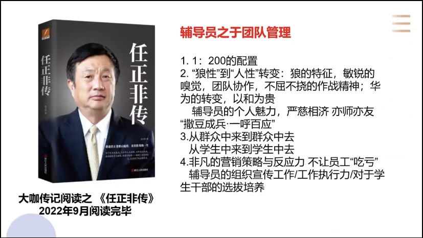 学校推行大咖传记阅读计划鼓励师生走近大咖,聆听智慧,结合暑假大咖传记阅读情况,任院长根据自己的阅读情况分享书籍《任正非传》同时对于工作再次进行延伸思考。任院长从任正非对于队伍的管理引申到辅导员团队管理中来,要从学生中来到学生中去,要以辅导员个人的魅力,严慈相济、亦师亦友,做到“撒豆成兵,一呼百应”。从任正非的不让员工“吃亏”到学生干部培养选拔、辅导员的组织宣传工作,帮助老师们能找到适合自己的方法做好团队管理。同时对于新入职的老师们提出共同期许,学高为师身正为范,更应该严格要求自己,加强师德师风建设,争做“四有好老师”。