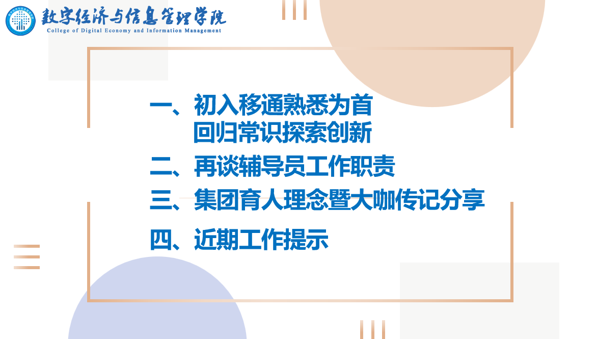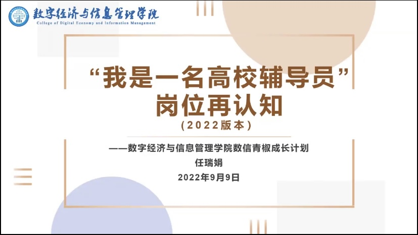 新学期开学在即,为做好新学期工作部署,增强新辅导员对于岗位认知,2022年9月9日19:30,数字经济与信息管理学院学工队伍通过腾讯会议APP开展青椒成长计划之“我是一名高校辅导员”岗位再认知暨新辅导员交流会,会议由数字经济与信息管理学院学工副院长任瑞娟老师主讲,数信学院全体辅导员参与培训交流。