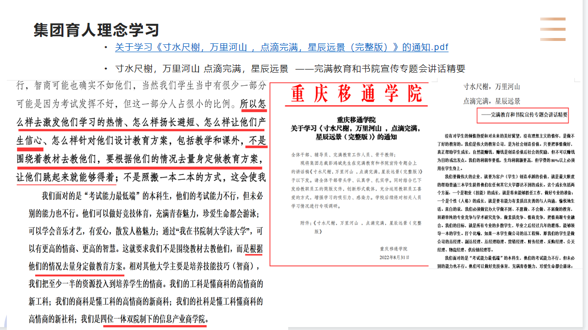 随后,任院长再次带领大家学习集团的育人理念,认真学习《寸水尺榭,万里山河,点滴完满,星辰远景》一文,强调我们不是围绕教材去教学生,应该根据学生的实际情况定制成长方案让他们跳起来就可以够得着。