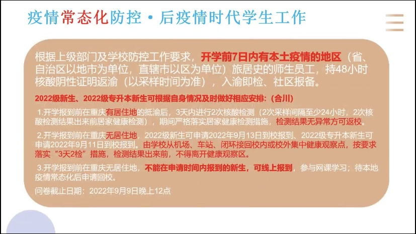 后疫情时代的学生管理工作,常态化防控与动态化更新给我们的工作难免会增加很多工作量,针对近期疫情返校情况工作进行相应提醒,对即将开展的迎新工作做出提示,要严格按照相应疫情防控工作要求开展。同时,祝愿老师们双节快乐!
