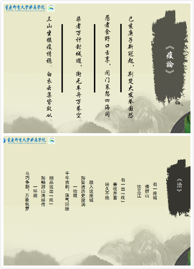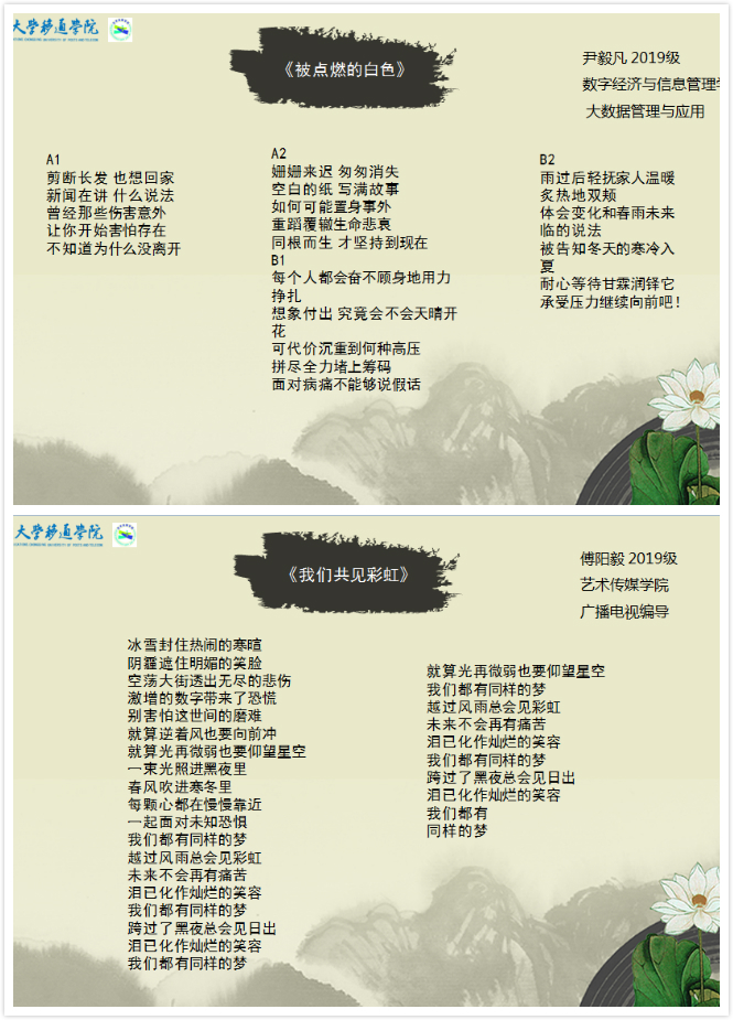诗词艺术是一种氛围,鼓励欣赏、乐于追求。疫情之下,生命可贵,我们同心战疫。校园原创诗词大赏鼓励学子以诗歌和歌词来表达自我、展示自我,在艺术创作中学会对生命的敬畏、学会对生命的思考,用情感来孕养心灵。