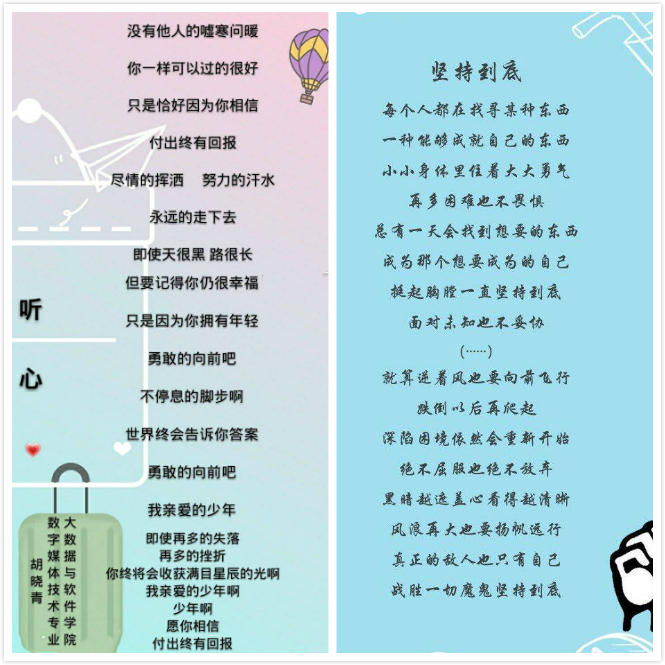用歌词来表达自己的情感,用诗歌来传达自己的信念,原创诗词大赏于5月6日开始作品收集,截止5月15日全校共计150余名同学报名参加,收到作品投稿170余份,创作主题包括“战疫情”、“戏剧节”、“感恩”等多个主题。