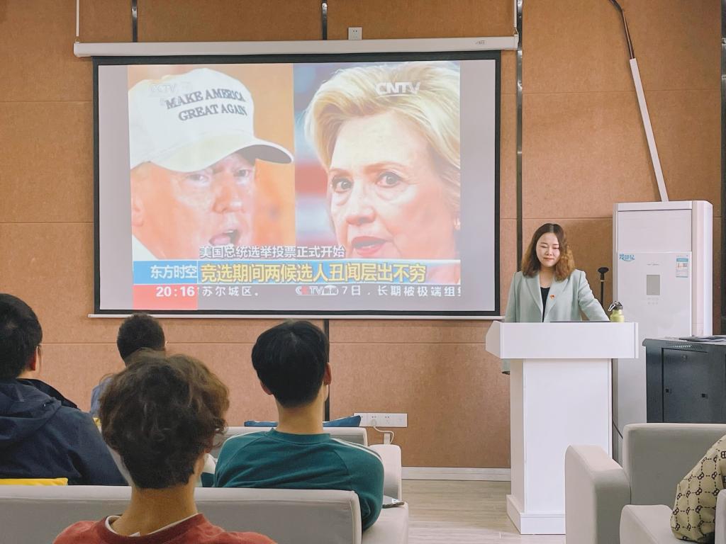 思政教学部政治理论教研室教师曹席老师,以“美国民主的来龙去脉”为主题,分“美国民主是怎么来的(美国民主的过去)”“美国民主是怎么样的(美国民主的现在)”“美国民主该怎么办的(美国民主的未来)”三个部分做了讲解。曹老师说到:“美式民主实质上是资产阶级民主,有它的历史进步性,也有严重的阶级和历史的局限性,只有最终向社会主义的真正的人民民主转变才有出路。”