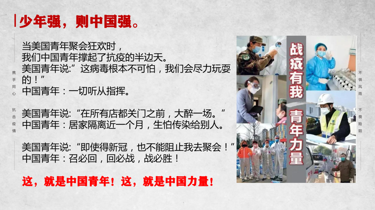 邹老师的讲课非常通俗易懂,敢说敢讲,犀利的列举了一系列此次美国政府在抗击疫情期间的一些荒唐宣传与应对措施,生动形象的展示了面对同样的疫情,我国与别国的对比。中国充分展示了大国的有责任有担当形象,不放弃任何一位疫情患者;湖北6000万人的“牺牲精神”,全国各地火速驰援湖北;除了奔赴一线的医疗人员,全国人民自愿在家隔离,不给社会添麻烦。此刻,我想说,我为生活在繁荣富强、有责任、有担当的中国而感到无比的骄傲自豪。