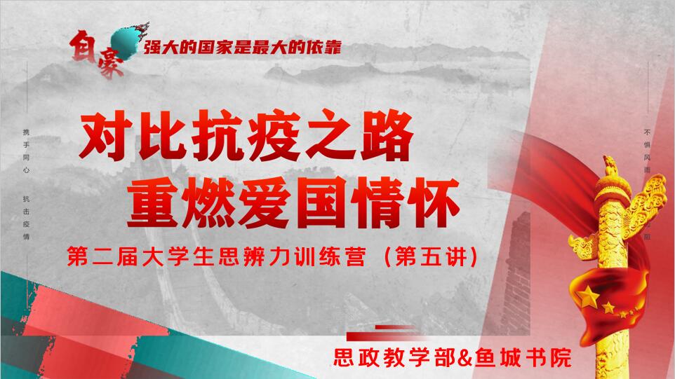 邹老师的讲授在不知不觉中落下帷幕。本次讲座不仅引发了同学们对于当前中外抗击疫情问题的深入思考,更培养了同学们的爱国情怀,思政教学部也致力于将理论教学与实践教学相统一,不断推进我校思想政治教育工作的创新与发展,鱼城书院与思政教学部的紧密合作为同学们送来了一场爱国主义教育的精神盛宴。思辨力训练营由鱼城书院主办,为更好的推进校园思辨文化,培养学生逻辑思维能力和语言表达能力应运而生。每一次讲座主讲人都从不同的角度为学员们展示看待这个世界的不同方式,每一位学术大咖的分享都会让学员们看到讲授者对思辨力的不同运用。期待同学们都能成为有态度、有深度、会思考、能辨析的人,也期待每一位学员都能在思辨力训练营的课程中有所感悟、收获。