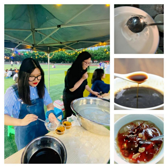 烈日炎炎,一碗碗冰凉可口的冰粉,消除夏日的烦躁与烦恼。美食协会现场制作冰粉,将一份份清爽的冰粉融合着社员们手中的“热爱”传递给大家。挖一勺凉粉盛于碗中,再勾一匙浓糖水,将凉粉捣碎,与糖水拌匀,那才是味蕾深处最甘甜的盛夏凉味。现场同学纷纷“抢”去品尝,冰冰凉凉的口感再搭配着歌手们动人的音律使同学们沉醉在这美妙的夏日夜晚。