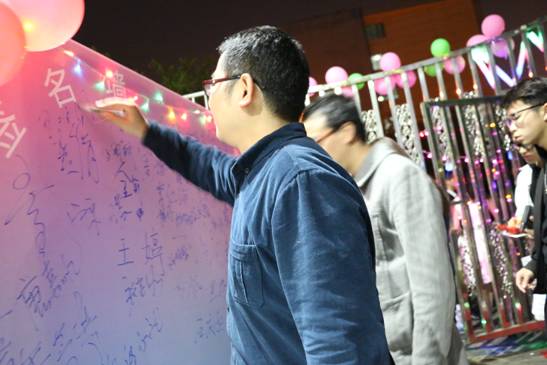 随着夜色临近,受到邀请的学院各级领导,各系部、各组织的老师和负责人以及部分同学陆续进入天池,他们在签名墙上写下自己的名字,更留下了对招协的祝福。晚七点整,酒会正式开始,随后的两个多小时,整个移通都进入了招协的节奏。