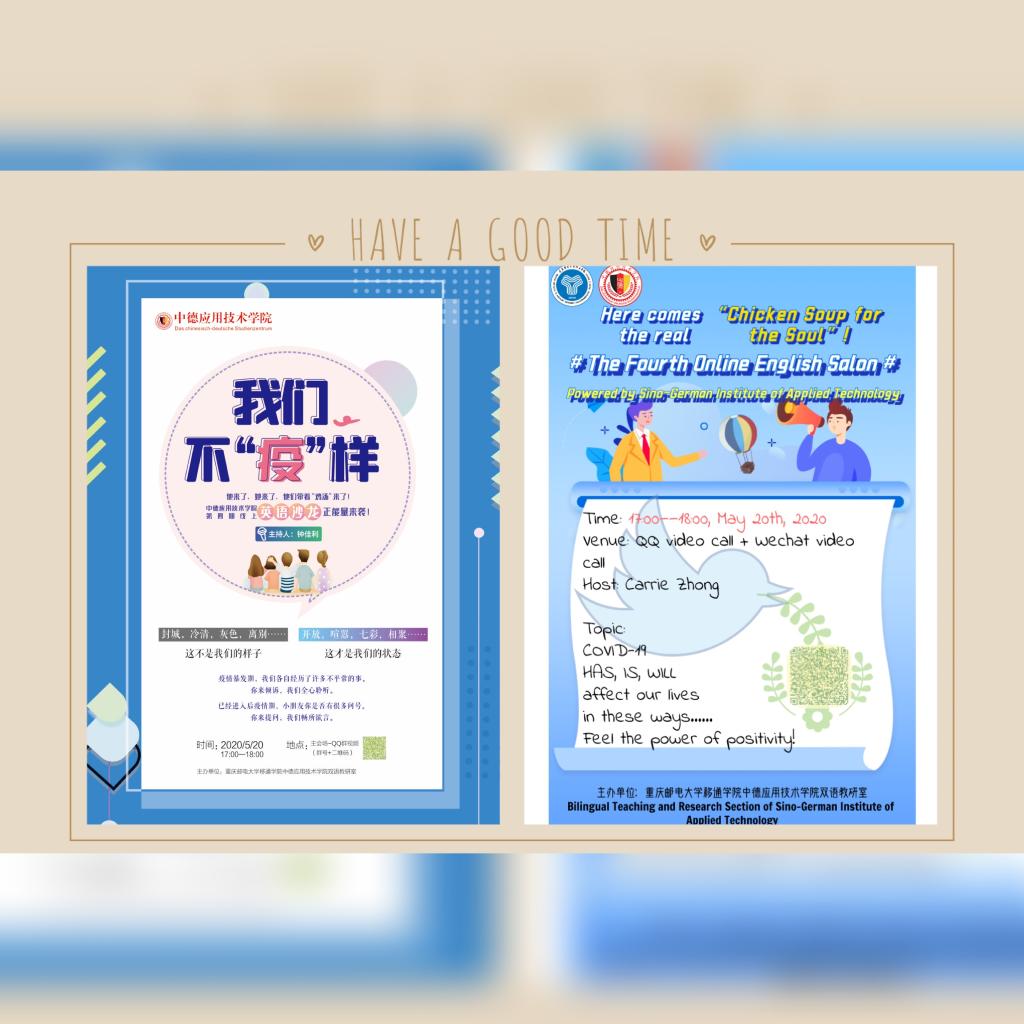 不“疫”样的我们,别样的线上“英语沙龙”活动临近尾声。此次线上活动为同学们营造了学习英语,训练口语的良好氛围,受到了同学们广泛的欢迎和好评。活动不仅丰富了同学们的课后文化生活,为同学们提升英语综合能力搭建了展示自我的平台,而且也不断提升了中德学院的雅思教学水平,是真正从学生学习和完满需求以及老师完满发展出发开展的“校园云端文化活动”。