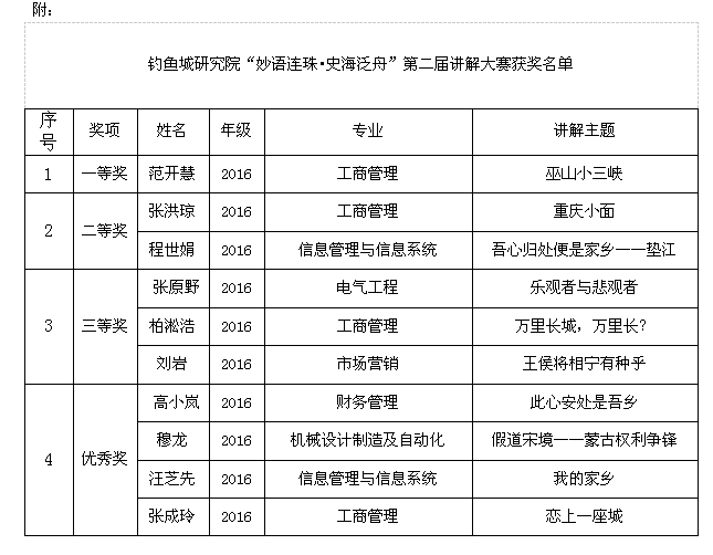 为了提高学生对历史文化的了解以及语言表达讲解技巧。钓鱼城研究院“妙语连珠·史海泛舟”第二届讲解大赛于6月11日晚上七点在钓鱼城历史文化博物馆多功能教室三如期举行。