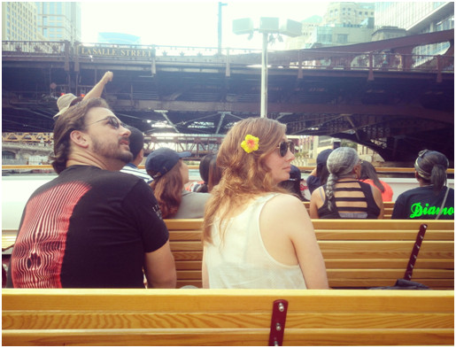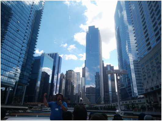 密歇根湖边的餐馆别有一番趣味,在暖洋洋的阳光下,伴着湖边的微风,品味着美食,让我们在一瞬间爱上了这座城市。随后我们坐着游轮游览芝加哥,游轮上的一位导游详细的为我们介绍着沿途的风景,所经过的每一个地方都有着属于它自己的历史传说与美丽的故事,穿梭在芝加哥的高楼大厦间,河道两边能看到芝加哥市民们骑车,喝咖啡,聊天,沐浴阳光。这种惬意、简单的生活节奏感染着我们。转过几条街,却又是繁华喧闹的大都市,让人眼花缭乱。