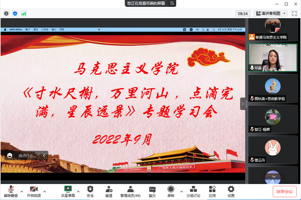 万美之中秋为最,正是收获好时节。为深入理解集团总裁彭鸿斌先生在完满教育和书院宣传专题会议上的讲话精神,9月15日下午,马克思主义学院在线上召开了《寸水尺榭,万里河山,点滴完满,星辰远景》学习集团总裁讲话精神专题会议,会议由学院院长邓燕主持,马院全体教师参加。