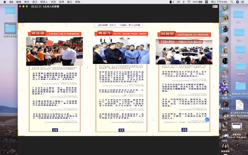 5月20日下午4点,我院举行了读后感线上交流分享评比,邀请了团委和中德的版块指导老师们担任评委。参赛选手一一展示了自己的作品,他们用精美的ppt与视频制作,声情并茂的诵读带领大家走近经典,感受了一遍文学的魅力。最后,中德辅导员莫晓雯老师做了总结点评,她希望参赛的同学们,摒弃功利性阅读,而记住这份精神上的共鸣,把读书当作一种兴趣,并坚持下去。多读书,读好书,养成终身阅读的习惯。