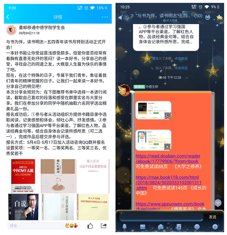 本次活动内容丰富,参与形式多样,趣味性十足。选取《平易近人:习近平的语言力量》,《中国人的精神》,《道路自信——中国为什么能》等贴合主题的书籍,同时还支持学习强国app自主选择阅读,参赛同学可以将阅读感受通过文字和制作音视频文件等方式进行分享。分享活动在近20天的阅读活动期间,吸引了校各院系同学的关注和参与。