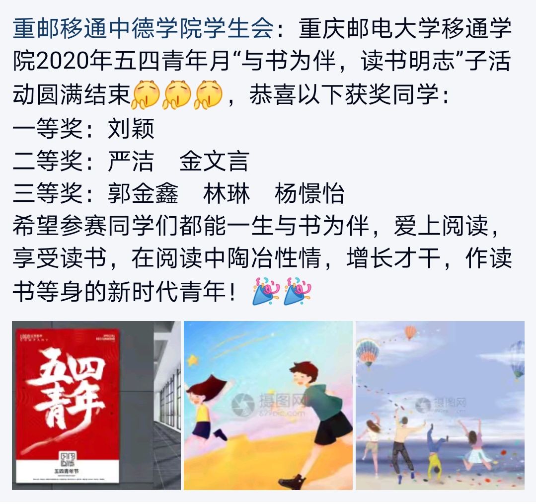“青年一代有理想、有本领、有担当,国家就有前途,民族就有希望。”为深入学习贯彻习近平新时代中国特色社会主义思想,传承并弘扬五四精神,结合我校“四位一体”育人理念,引导广大青年学生以青春之我、奋斗之我,在新时代开阔视野、坚定信念,5月20日下午4点,我院承办并在线上举行了校五四青年节“与书为伴,读书明志”的读书子活动评比活动。