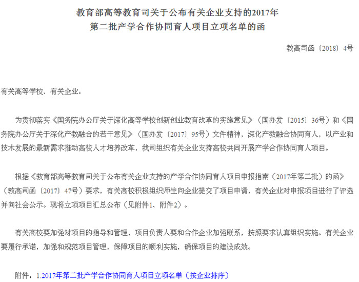 为贯彻落实《国务院办公厅关于深化高等学校创新创业教育改革的实施意见》(国办发〔2015〕36号)和《国务院办公厅关于深化产教融合的若干意见》(国办发〔2017〕95号)精神,深化产教融合、产学合作、协同育人,汇聚企业资源支持高校专业综合改革和创新创业教育,自2014年起,教育部高等教育司面向企业征集合作项目,由企业提供经费支持,以产业和技术发展的最新需求推动高校人才培养改革。