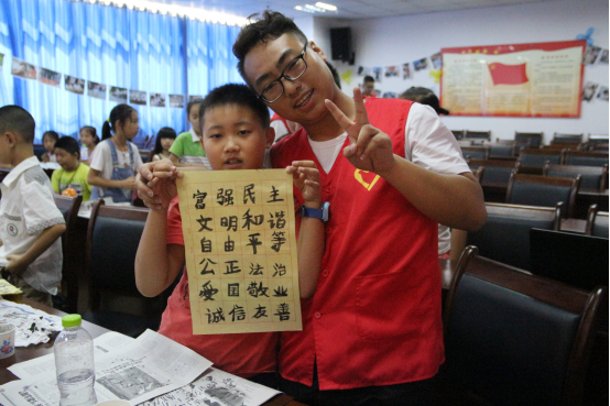 在那段日子里他们俩一起做手工、打羽毛球、一起练习书法……最后的一天时,志愿者们提议让小朋友上台来讲述这段时光的感受,他非常自信的走上了讲台,眼里满是坚定!他的发言得到了大家的掌声,毕鸿飞知道这掌声将会给他的成长带来勇敢,带给他最有力的力量!后来,刘力滔告诉毕鸿飞:“我要让全世界都知道,我很勇敢,谢谢你的鼓励”!临别之际,他们俩相互许下承诺,一起完成了一幅画,而这幅画,至今留在两人的心里,温暖着毕鸿飞和刘力滔!