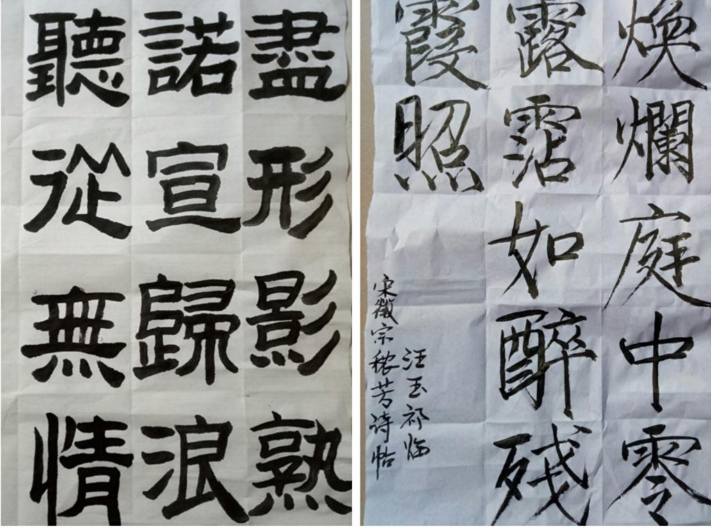汪玉祁:在练习的过程中,我明白的最深刻的道理是:欲速则不达。刚练习的时候,我带着强烈的目的性,心性比较浮躁,很想一下子达到高水平。但练习后发现,越练习越差,有想放弃的念头。后来,有北山书院邀请的书法大师亲临现场实地教学,我跟着慢慢学习,大概学会了一些笔画的写法,逐渐有了信心。我的字,从歪歪扭扭到现在的小有成果,整个人平静了不少。现在我发现,不是我写的不好,而是练习的太少,任何事都需要坚持和时间的沉淀,这是书法研习带给我的最大感触。