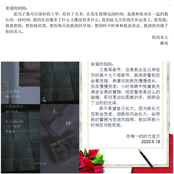 在2020年母亲节来临之际,我院青年志愿者协会于5月10日至5月16日举行母亲节特别活动,感恩母亲,为爱发声。活动中,同学们自发为母亲制作贺卡、亲手做一顿饭、献花。举办母亲节感恩活动,让同学们学会了勇敢表达爱,更加珍惜与母亲的相处时光,以己之力回报母亲的无私付出,也传达了我院青协全体成员的一个愿望:祝愿天下母亲节日快乐、健康美丽!