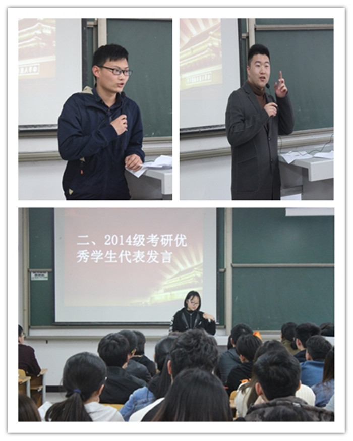 此外,宣讲会还邀请我校2014级通信工程专业已通过2018年考研初试的查晓晶、毛从雷、张义富三位同学,他们用自己的切身经历给大家分享了各自的考研心路历程及如何备考等信息。