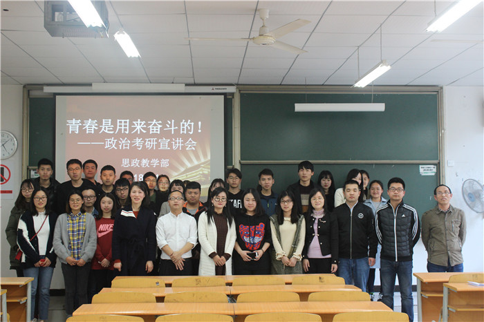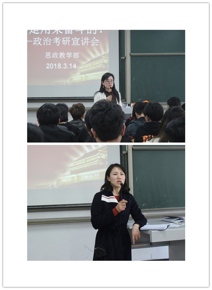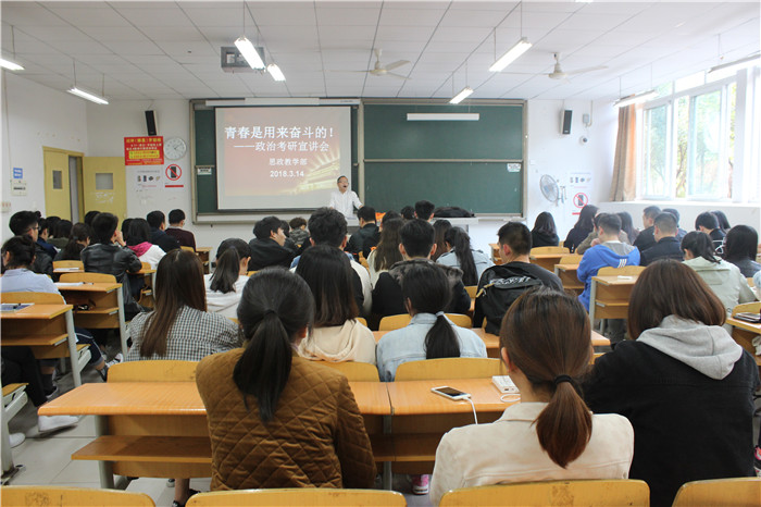 为进一步提高我校学生的考研热情,3月14日下午4点,思政教学部在4102教室举行了政治考研宣讲会。此次宣讲会为大三考研的学生提供了宝贵的建议、指明了合适的发展方向,同时让大一、大二的同学对考研有初步的了解。本次宣讲会由政治理论教研室主任邹建平老师主持,教研室其他老师参加,到会学生近100人。