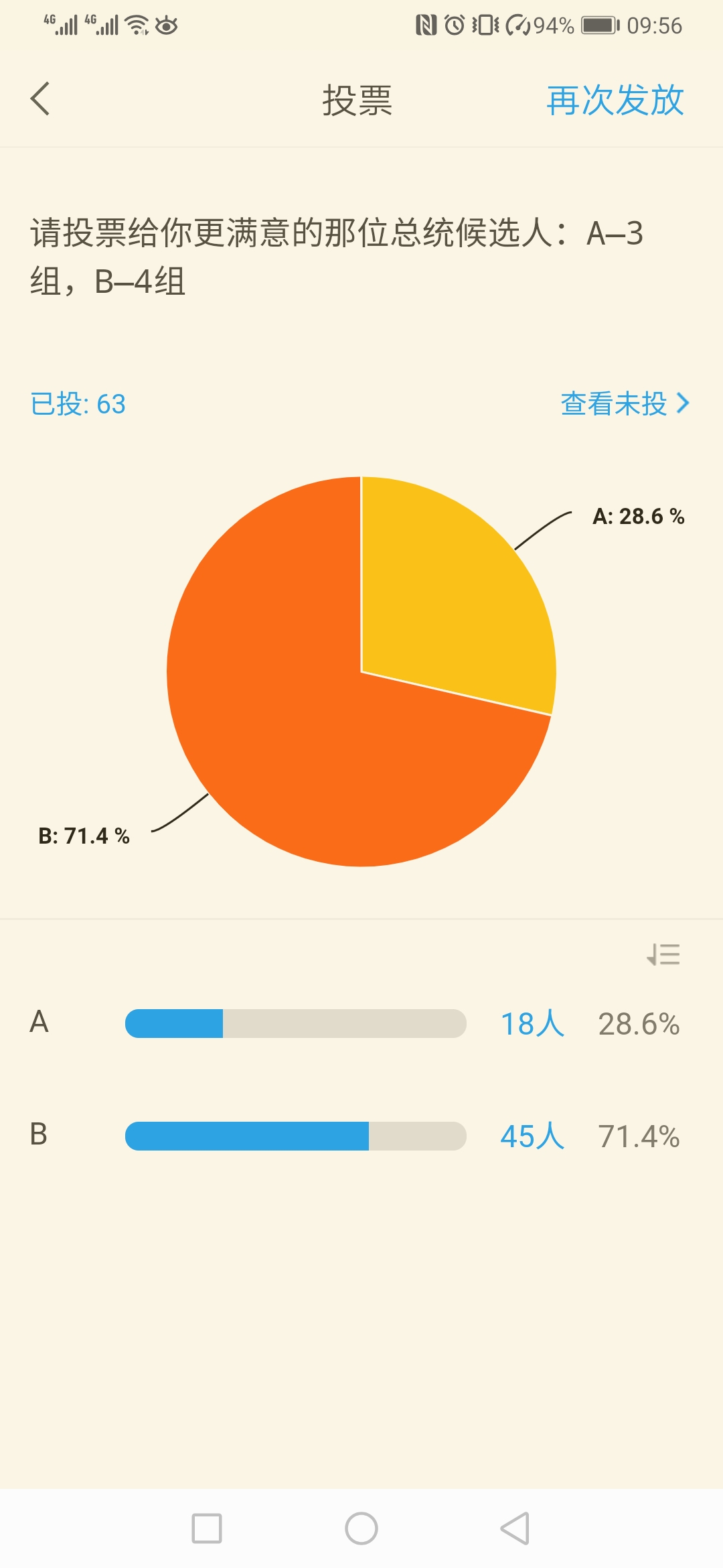 随后而来的是更为激烈的场面,各小组成员为自己所在小组总统候选人站台、讲话、呐喊、助威,以赢取全班同学的投票,其投票过程在“学习通”APP上进行。