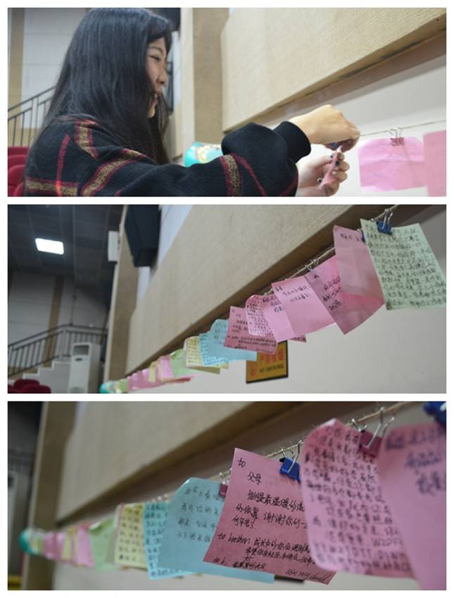 大会最后,由工作人员为同学们发放便利贴,同学们将自己想表达的感恩祝福语写在便利贴上,并夹在宣传夹,让同学们的感恩之情洒满教室。最后,宣传夹上夹了满满的祝福语,同时同学们的感激之情也洋溢在校园里。
