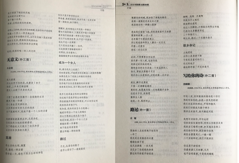 我校创意写作学院近几年成果斐然,学生的各类文学作品遍地开花,跻身于全国高校大学生创作前列,也引起了很多名刊的重视。看得出来,有着47岁高龄的老牌《红豆》杂志为了这枚“集束手榴弹”的爆响,也是经过了好一番精心策划,他们大方豪气地拿出八个页码,由10月份刚夺得全国诗歌大奖的黄明洋,带着我校作家班另外四名学生,再加上成名已久的苏瓷瓷老师精心指导,组团“霸屏”《红豆》,这一波儿操作实在吸引眼球。杂志出刊后,不断有各地文朋诗友表示热烈祝贺。