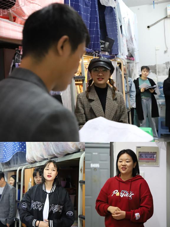 当寝室门轻轻打开,映入眼帘的就是同学们热情的笑脸和干净整洁的宿舍。老师们走进寝室,亲切的询问同学们的学习和生活情况,各寝室的代表也会进行一分钟的自我介绍。陈帅老师进入寝室后,询问了寝室中的过级情况,了解到该寝室成员有三位同学已经过了四级,其中还有一位同学在进行六级的备考中。