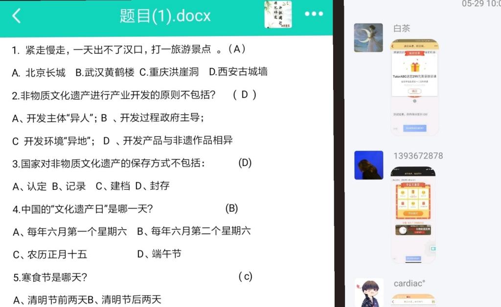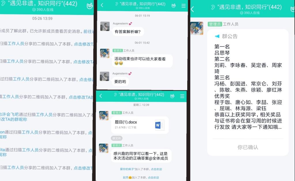 “遇见非遗,知识同行”知识竞赛活动采取线上参与扫码答题的形式,在18分钟里完成42道题,包括16道单选、16道多选、10道判断。答题内容包括了民间文学、传统手工技艺、戏剧、舞蹈等文化遗产内容,以及非遗概念、内涵、保护政策与法规等内容。当活动二维码发出后,同学们陆续地开始答题,随着答题人数的增加,活动日趋激烈,激发同学们的参与性。当代非物质文化遗产与生活还有一定的距离,而高速的科技发展也让年轻人与中华传统文化渐行渐远,新青年学习非遗文化刻不容缓。在答题的十几分钟里,大家近距离体会了传统技艺五花八门和中华文化博大精深。