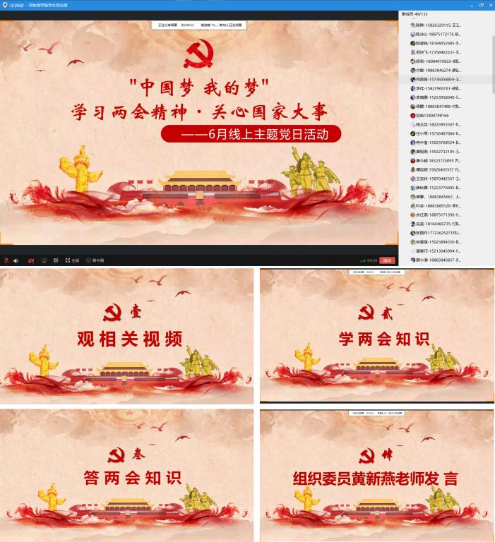 为学习贯彻全国“两会”和习近平总书记重要讲话精神,积极贯彻全国两会精神会议的各项部署要求,树牢四个意识、坚定四个自信、做到两个维护、学好理论,注重实践,以行动出效果。2020年6月10日下午4点,淬炼商学院学生党支部在线上展开了以“‘中国梦·我的梦’学习两会精神·关心国家大事”为主题的主题党日活动。