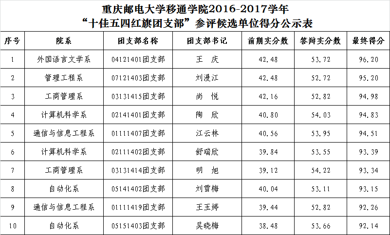 经过前期考评和现场答辩,大会结束之后,工作人员在各位学生书记的监督下,最终确认2016-2017学年“十佳五四红旗团支部”,名单公示如下: