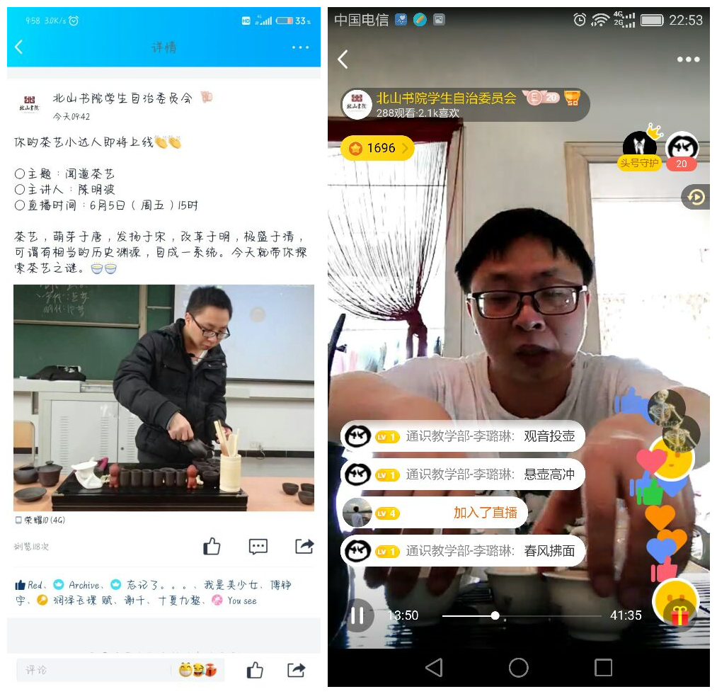 为了进一步发挥学校“四位一体+双院制”人才培养模式的优势,打造通识与书院联合育人的平台,实现通识教育“知识+能力+素养”的育人目标,丰富书院活动的多样化体系,2020年6月5日下午15:00,通识教学部人文艺术教研室哲学老师陈明波受北山书院邀请,利用书院直播平台,进行了一个半小时的茶艺直播活动,为学生提供了一场全方位了解茶文化的精神盛宴。