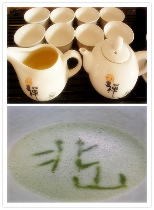 对基础的理论知识讲解完毕后,陈老师便结合具体的泡茶流程,对明代的泡茶和宋代的点茶的每一个步骤进行了详细的解说。明代的泡茶工艺经过发展,形成了“工夫茶艺”,功夫茶艺分为八个步骤:白鹤沐浴、观音投壶、悬壶高冲、春风拂面、关公巡城、韩信点兵、鉴赏汤色和品啜甘霖。陈老师对每个泡茶步骤都做了一一示范,以希同学们能掌握基本的泡茶技巧;对于宋代的点茶,陈老师结合日本的抹茶道进行了讲解:先将饼茶烤炙,再敲碎碾成细末,用茶筛将茶末筛细,将筛过的茶末放入茶盏中,注入少量开水,搅拌均匀,再注入开水,用茶筅反复击打,使之产生泡沫(称为汤花),最后在汤花上作画。陈老师讲解完毕后,即兴在汤花上写下了“北山”两个字,表达了对北山书院的蓬勃发展的美好祝愿。