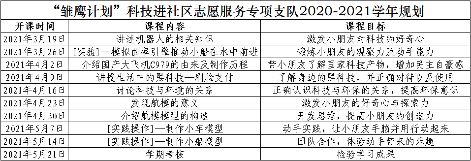 科技兴则国兴,为帮助孩子们正确理解科技强国的含义,让孩子们建立起探索未来科技的兴趣,科技与航模走进了课堂。同时,为积极响应学校志愿服务活动,提高志愿服务参与度,在百花齐放的三月,“雏鹰计划”的志愿者们将再一次踏入东渡小学。在新的一学期,志愿者们积极参与到志愿服务活动之中,并且“雏鹰计划”志愿者服务专项支队还对过去和未来做了相应的总结和规划,以便后续工作得以有效的开展。