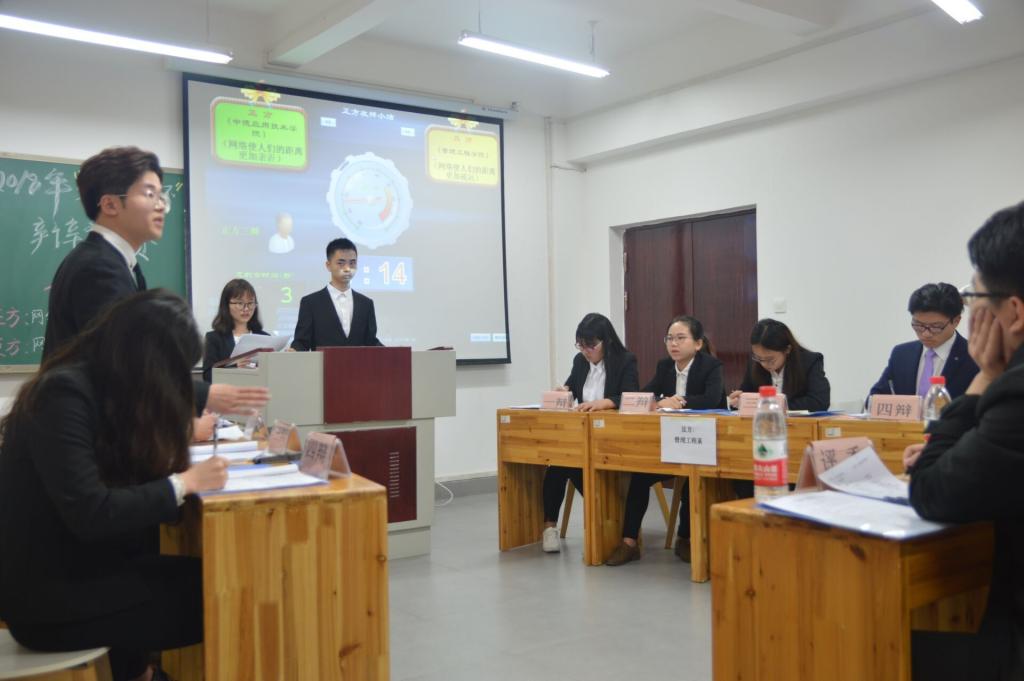 比赛如火如荼的进行,转眼间到了初赛的最后一天。“网络使人们的关系是更亲密还是更疏远。”正方三辩提到:“两人不单单只有见面才能亲近,网络更多是用语言进行心与心的交流。所以我方认为网络使关系更亲近”反方则反驳道:“如果网络能使人们亲近,为什么会有《常回家看看》这首歌,为什么过年还会出现“春运”这种状态呢?”双方辩手思路清晰,引经据典,有时也不乏些许的幽默,给严肃紧张的辩论场上增添了一份欢愉。