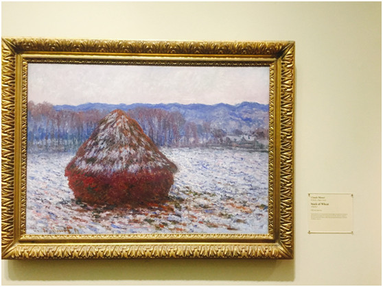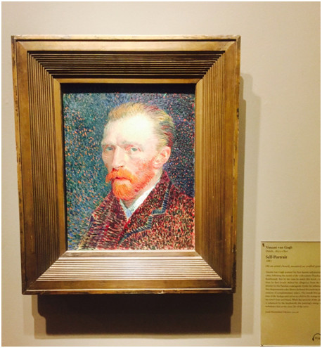 漫步在博物馆中,看着一幅幅作品,大家时而驻足欣赏时而陷入沉思,仿佛有一种强大的力量让我们置身于画中的世界。当走到知名画家梵高的自画像前,很明显能感觉到这是他晚期的作品,有别于早期作品色彩灰暗,这幅画画面色彩强烈,使用色调明亮的点彩画法。追求画面的平面感、装饰性和寓意性。梵高的作品中包含着深刻的悲剧意识,强烈的个性和形式上的独特追求,一切形式都在激烈的精神支配下跳跃和扭动。接着,我们又欣赏了画家莫奈的一些作品。