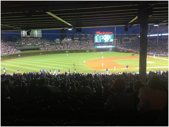 下午,我们去现场观看了芝加哥小熊对VS辛辛那提红人队的棒球赛。刚开始大家都不懂规则,随着比赛的进行以及旁边朋友的帮助,大家慢慢了解了大致的规则,但是这并不妨碍我们感受到各队球迷的热情以及美国的棒球文化。每当有球队得分,都会站起来欢呼,中场休息时间,全场都会站起来合唱歌曲,很多球迷还会一起跳舞,深深的被现场的热情所感染。最后芝加哥小熊队以9:2战胜了对手。
