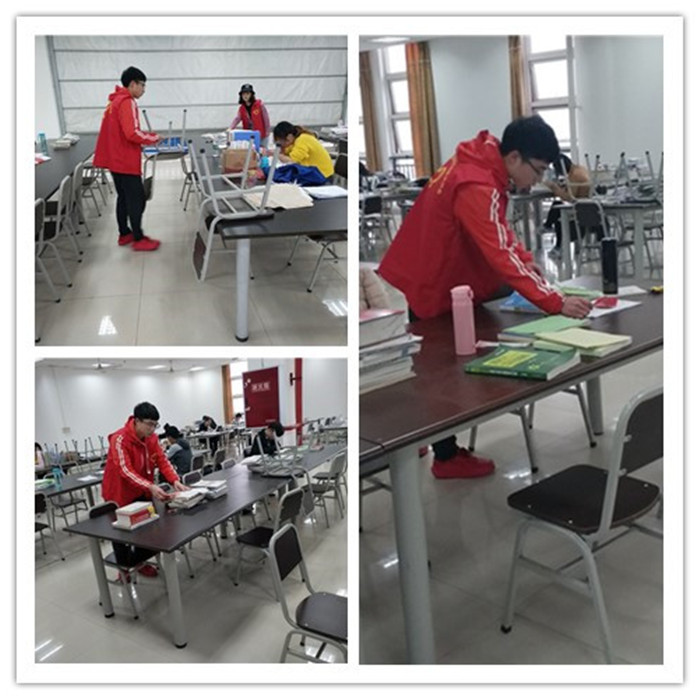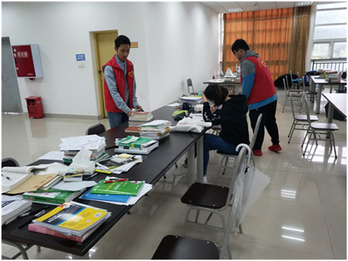 在整理的过程中,志愿者都尽量不会打扰到同学们学习。但是偶尔经过他们身旁,或者脚下有垃圾,同学也没有露出不开心的神色,反而主动站起身来让志愿者打扫或自行捡起垃圾,整个活动进行的非常顺利。
