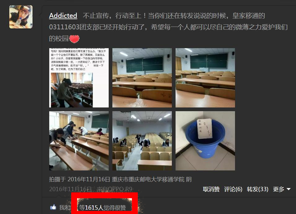 为了让更多的人能投入到爱护教室环境的活动中,我们用线上转发的形式号召全校乃至全市各高校的同学爱护教室清洁,保护校园环境。说说一发出,线上影响不仅轰动了移通校园,更是扩散到了各高校,短短三个小时现场参与人数达到506人次。截至21日晚12点整,线上点赞转发人数达2016人,线上线下影响人群累计2522人,爱心仍在传播,辐射人数仍在不断扩大!因为抱有责任,所以我不辞辛劳,我没有辜负团支部成员对我的信任,我们行动至上!