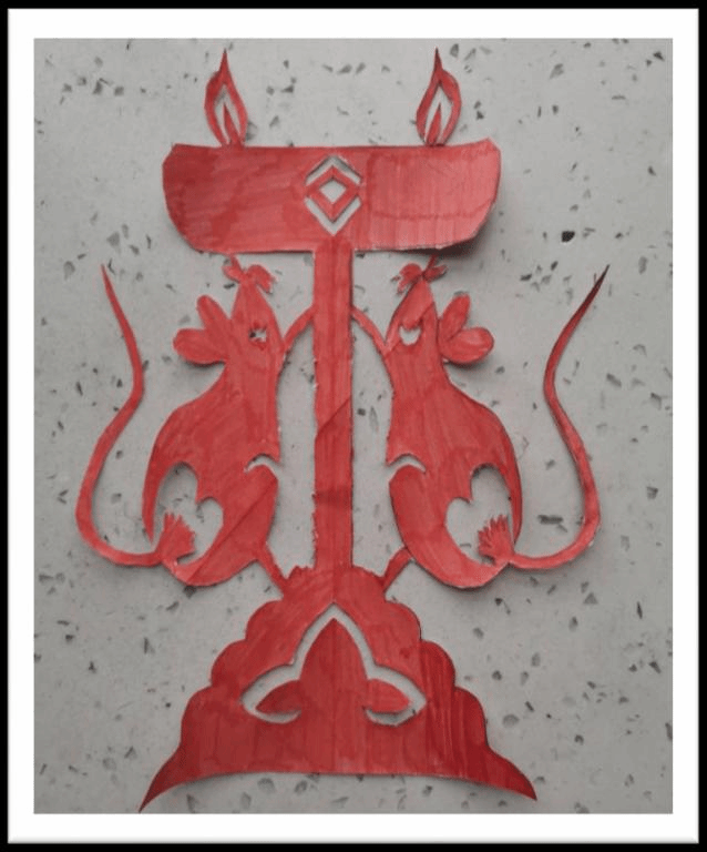 “小鼠偷油图”。两个老鼠活泼灵动,争先涌上灯台,给人一种欢乐的感觉,在简单的剪裁之间,将童年的快乐与轻松引上心头,令人愉悦。