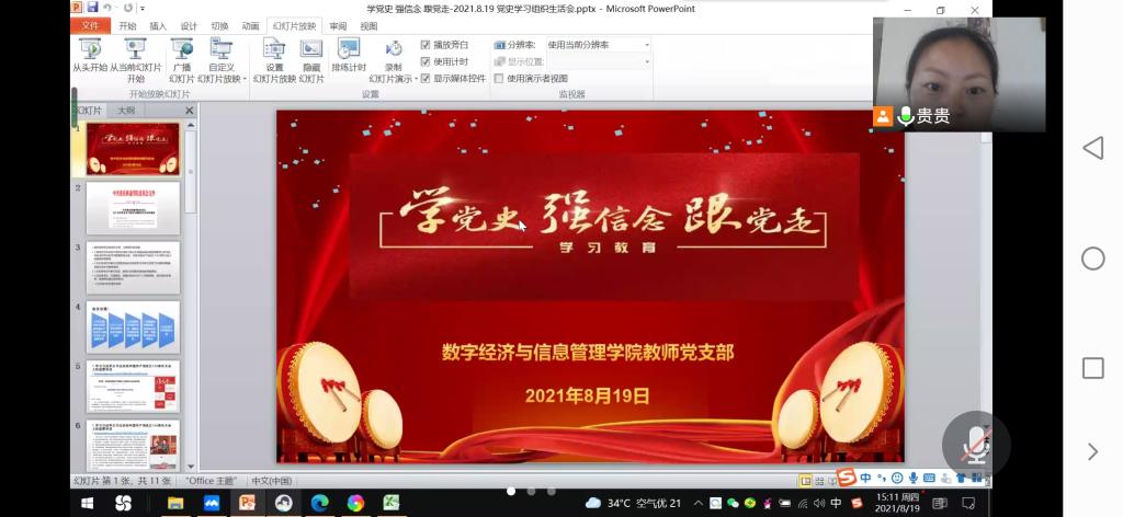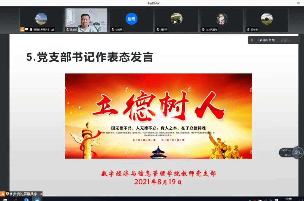 根据学校党史学习的总体要求,更好提高我院教师党员的党性觉悟意识,8月19日下午15:00-17:00,数字经济与信息管理学院教师党支部,在支部书记刘贵容同志的带领下,通过腾讯会议线上开展了暑期党史学习专题会议,会议由支部书记刘贵容主持。